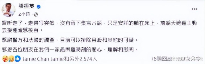 对于小女儿的离世,梁振英表示排除了自杀和他杀,女儿是躺在床上离世的,离世之前还接种了流感疫苗。